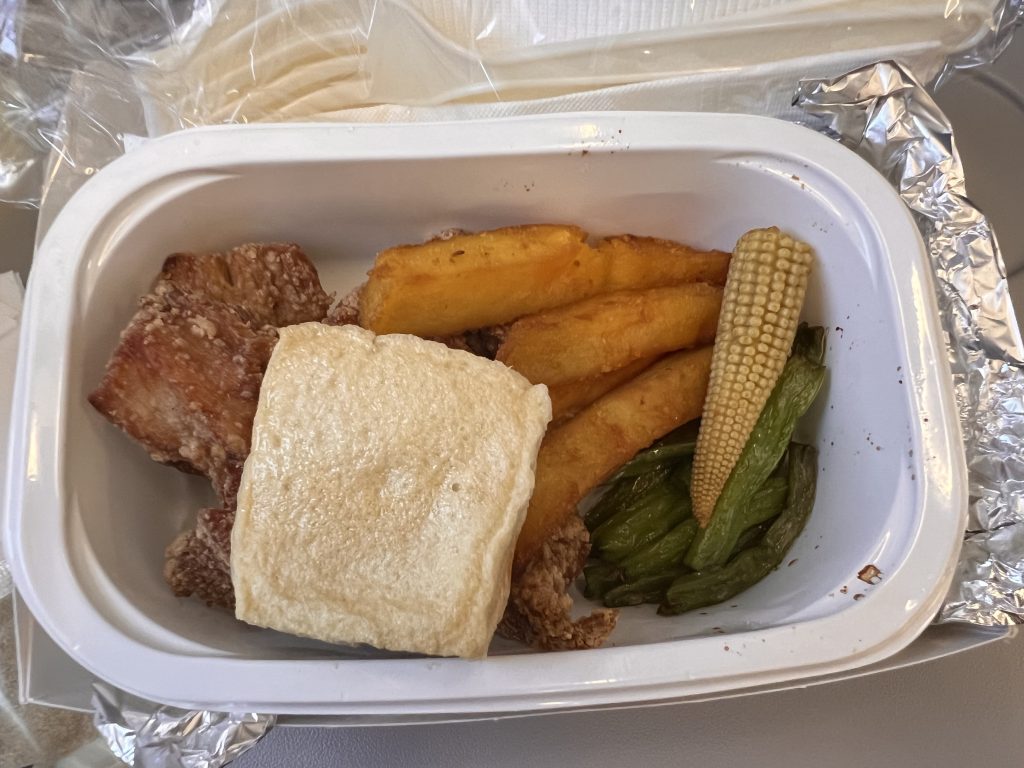 然後一直很想知道台虎飛機上到底會帶幾份餐,就算不是網路預約限定品項也很容易都是缺貨,最後只好點了鹽酥雞來吃(對~我知道這很盤子 300多大洋喔~)
