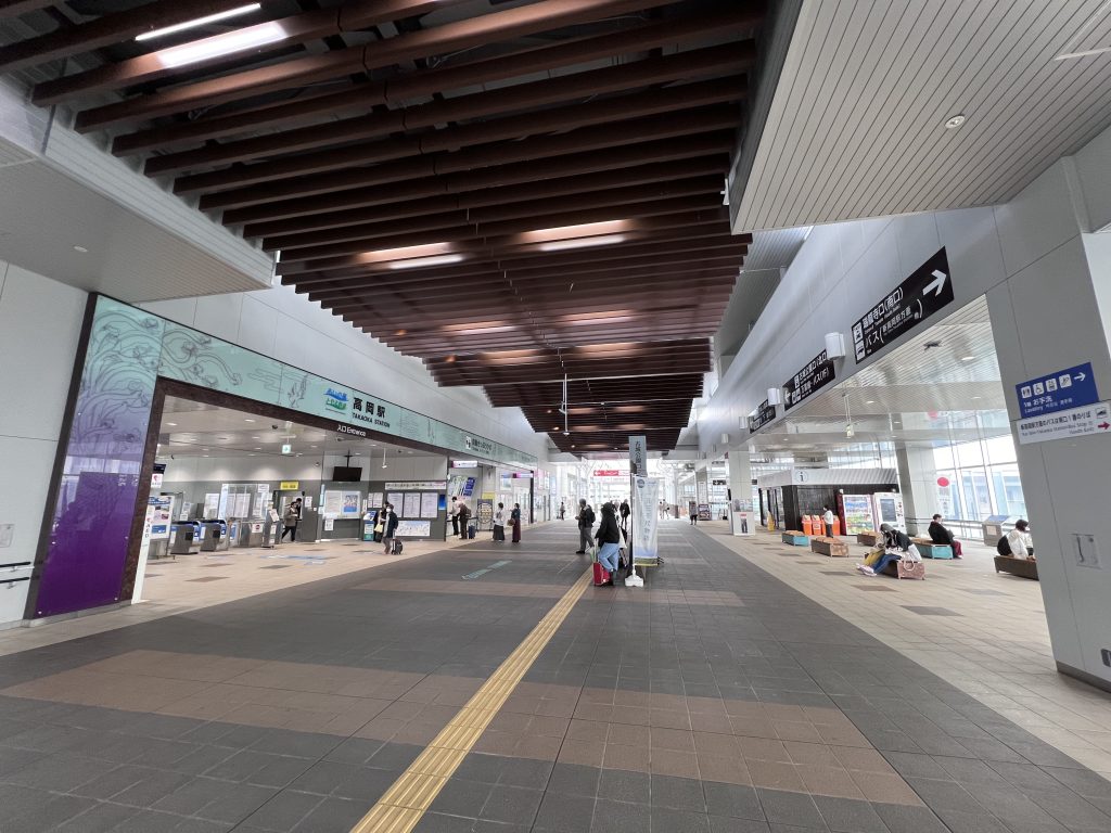高岡站是一個跨站式的站體,靠近古城公園口的一側有連結一棟商業設施,主要的商店都集中在那一區中