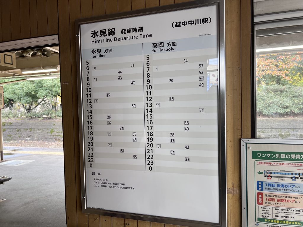 目前新高岡大概一小時1~2班車,在2024年3月北陸新幹線延伸通車之後直達的範圍就會變成敦賀到東京了,未來北陸城市之間的移動也是越來越方便了,但是相對的JR西日本的PASS又要改版了~~~未來JR西日本已經考慮把城端線跟冰見線轉移給地方經營,希望之後北陸會推出有整合的PASS可以利用,讓外國人可以探訪更多地方~