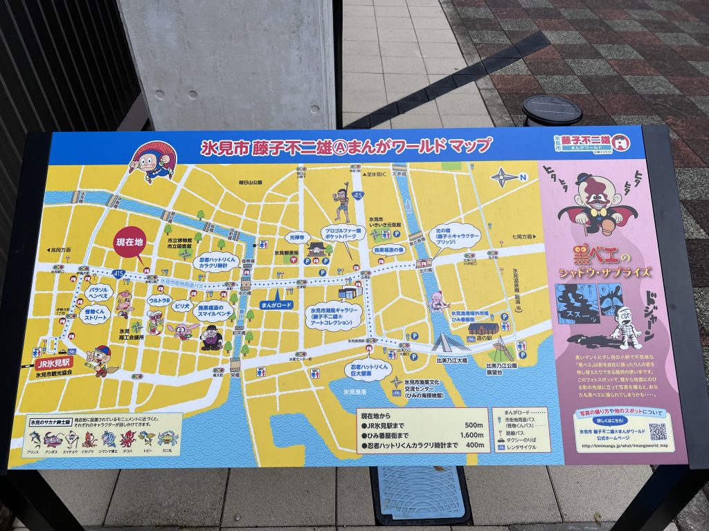 另外冰見是著名漫畫家藤子不二雄Ⓐ的故鄉,在台灣大家最耳熟能詳的作品應該是忍者哈特利吧,在市區內有非常多作品的模型跟彩繪