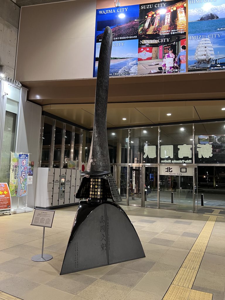 新高岡站內擺放了一個高岡大兜,是以前田利長的頭盔為本所新製的,車站內沒甚麼商家,除了便當店之外就是7-11,土產也是在7-11裡面購買