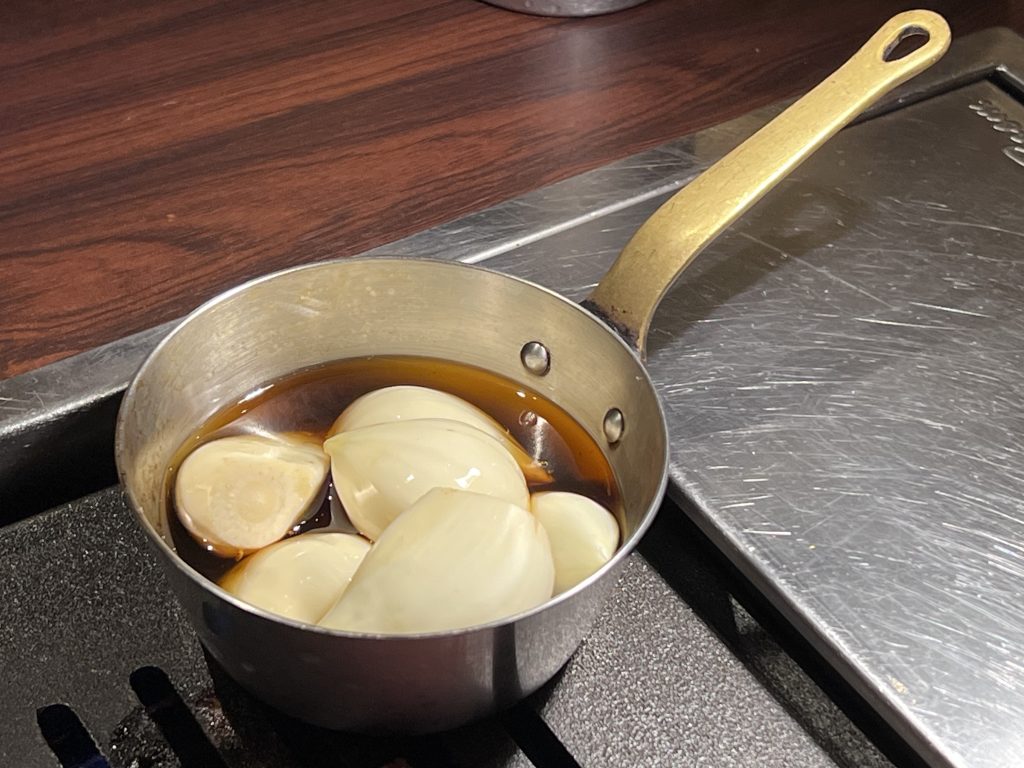 就是把大蒜仁放在橄欖油裡面,會給一個小鍋直接放在鐵板上煮炸好的大蒜很香很好吃~