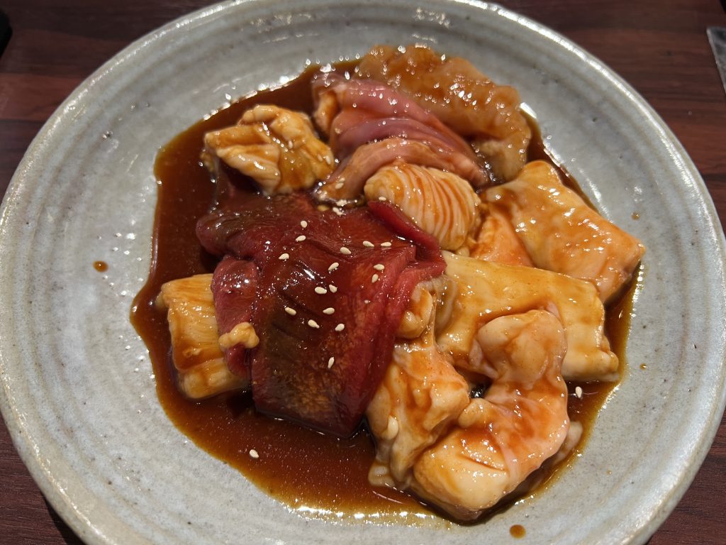 店家招牌都寫內臟燒肉了當然要點來吃看看~內臟拼盤混和了不少部位,看起來應該是牛胃跟牛腸一類的,每一種部位部位都不錯吃~口感都非常的Q彈,尤其腸類的有點油花我非常喜歡,很耐嚼味道又很夠只是蠻可惜台灣的燒肉店比較少有提供內臟的菜單選擇