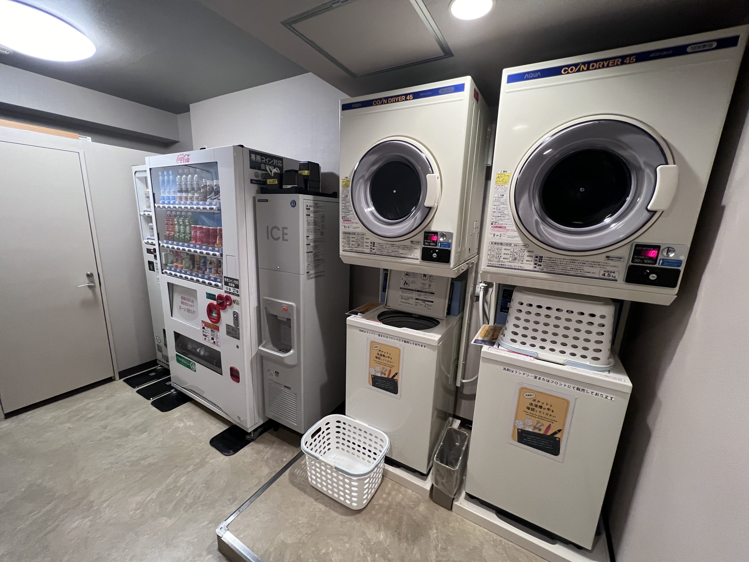 浴場入口旁邊有一台自動販賣機跟洗衣機烘衣機各兩台