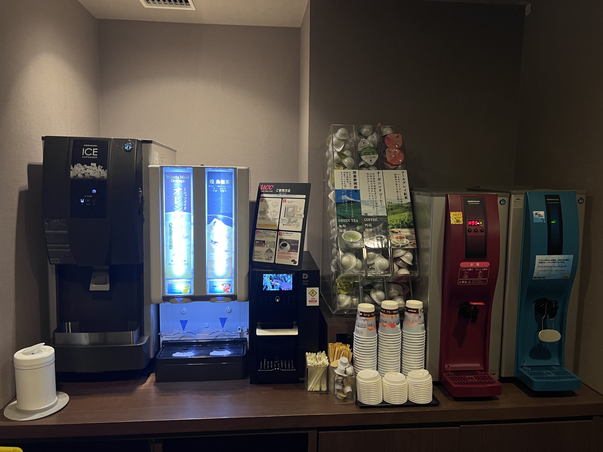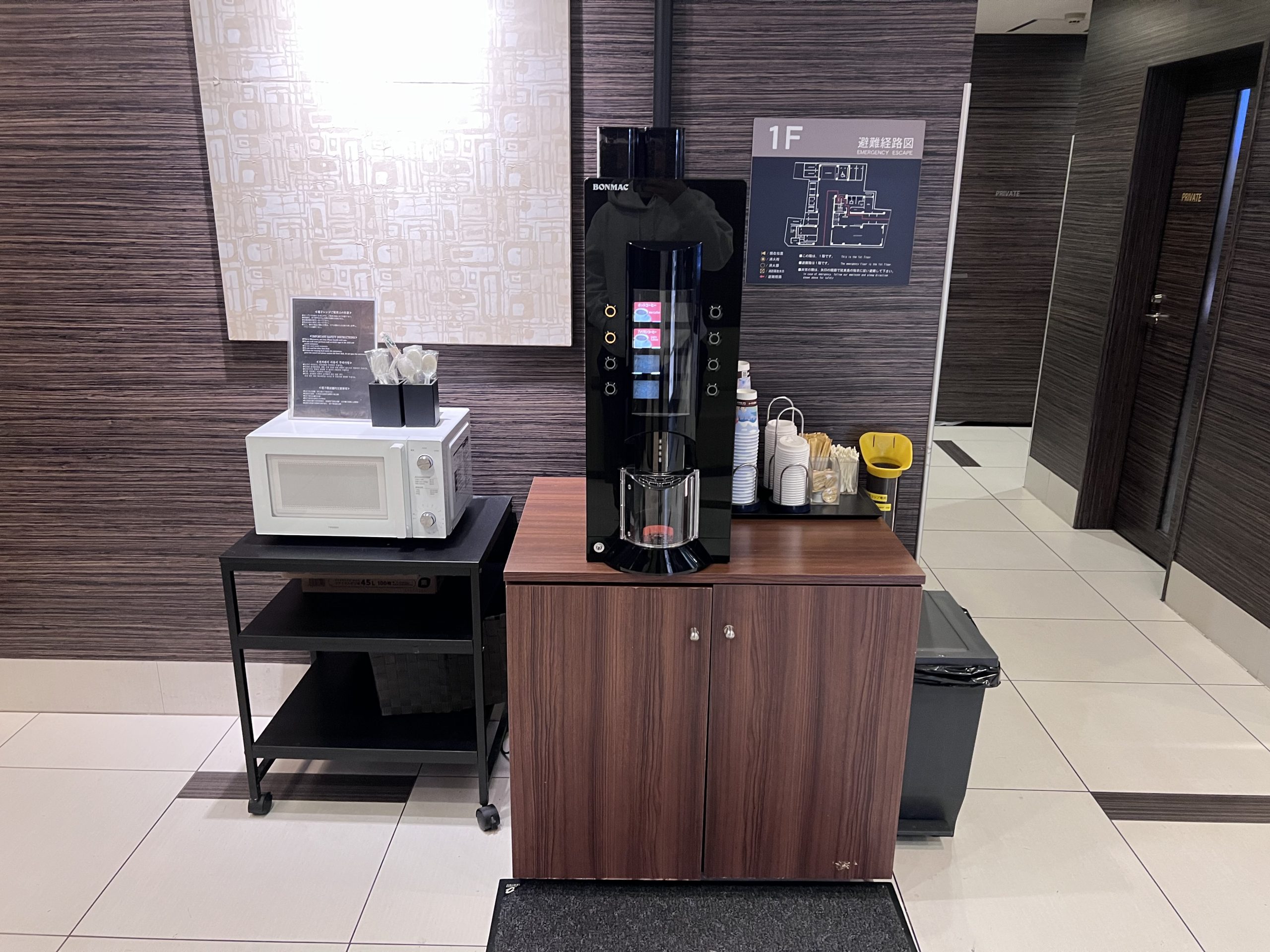 大廳旁有咖啡機、一些備品、外幣兌換機以及便利商店的專用出入口