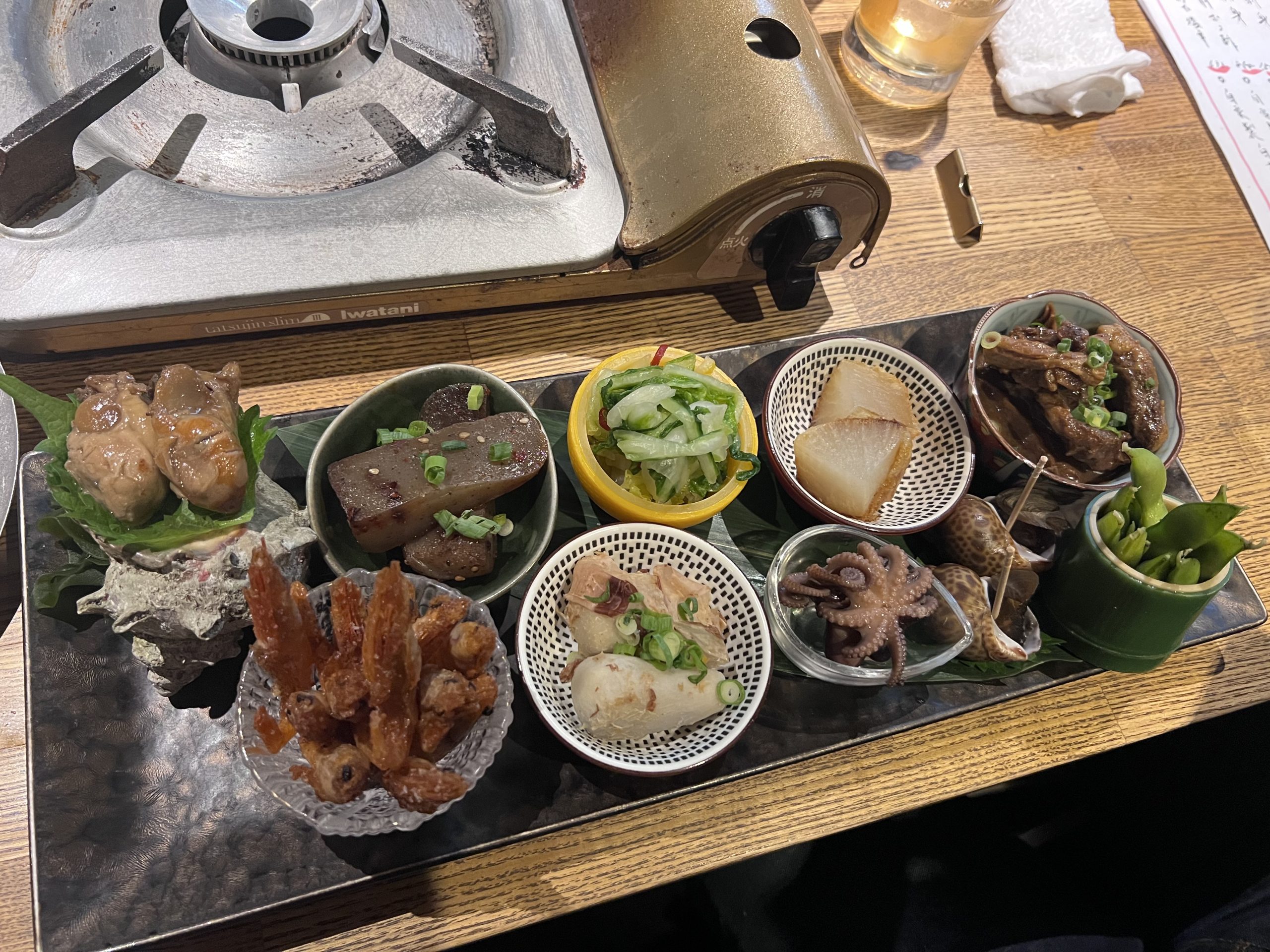 以及醃菜、里芋、麻辣蒟蒻、炸小蝦以及橄欖油漬牡蠣