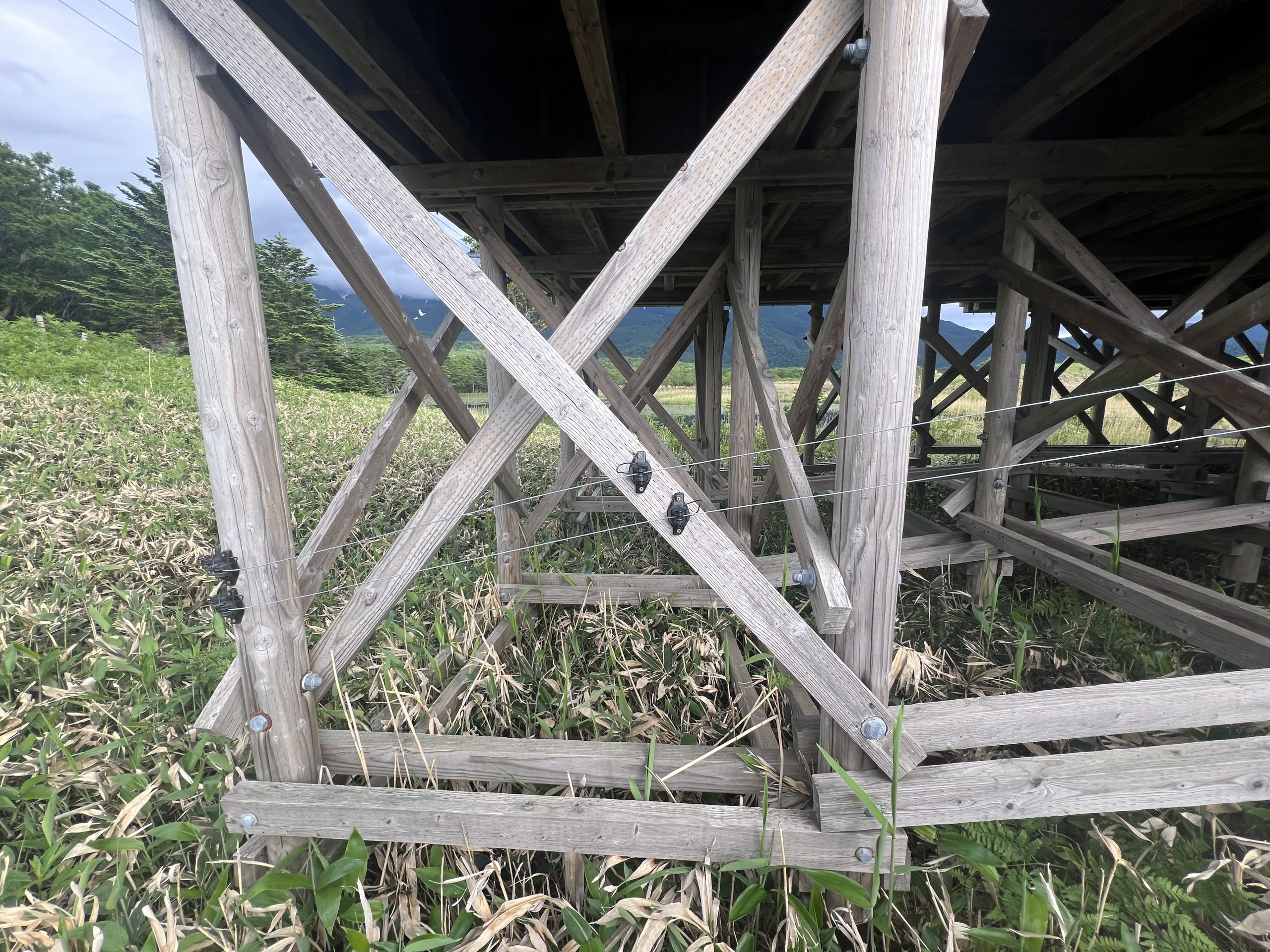 木棧道的下方全部都有使用高壓線電網拉出隔離區避免熊靠近